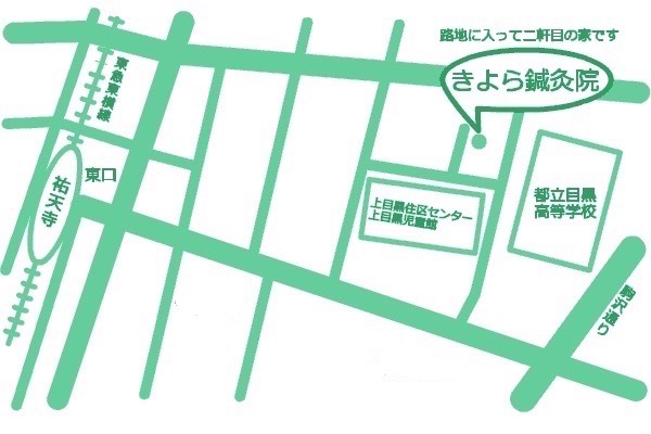 中央改札 東口1を出て右へ。バス停のあるロータリー前の祐天寺ストリートをまっすぐ、駒沢通りに出る前に左折。上目黒児童館と都立目黒高校のそばです。