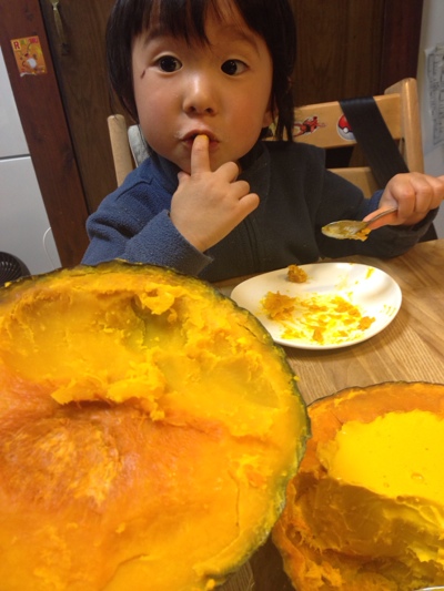 蓋部分もほじって食べてくれる二歳の甥っ子。