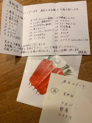 野菜と一緒に写真をコラージュした手作り封筒に手書きの出荷野菜リストと手紙が入っていて
