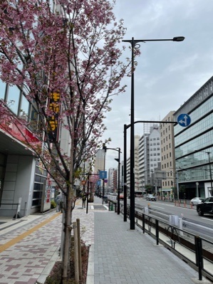 ドンキホーテの前あたりに真新しいピンクの早咲きの桜が植えられてらり、