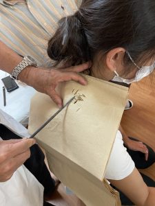 先生が自ら配合した漢方エキスと墨を混ぜた液体を筆でささっと身体に塗ります。