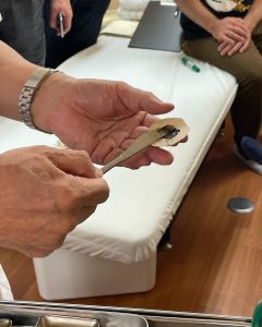 今回使う軟膏は先生達が研究会の方々と作ったオリジナル軟膏です。猪の脂で練ってあるらしい。