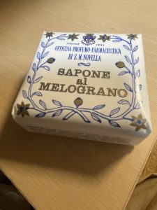 今回の新婚旅行のお土産、Santa Maria Novella教会の売店の石鹸。私と彼女と、大学のツアーで30年以上前に行った場所です。