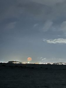 テラスで夜更けまでバーベキューをし、遠くには花火も見えて