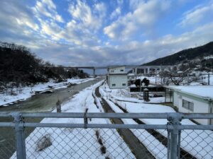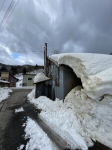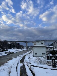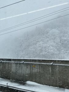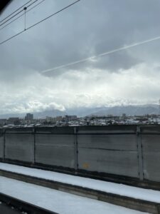 大宮から長野を過ぎたあたりで雪がちらつき始めます。